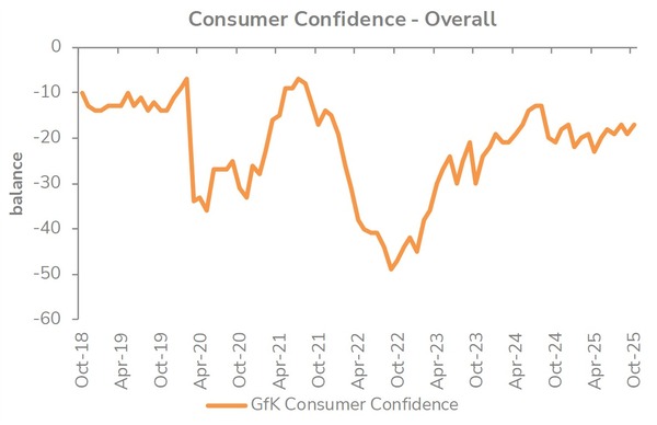 The broader economic picture offered little short-term encouragement. Consumer confidence fell to -xx, with the cost of essentials and concerns over future tax increases in next month’s Autumn Budget continuing to dampen household sentiment.