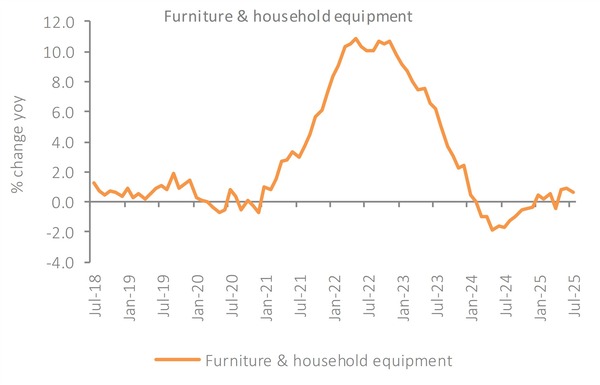 Furniture & Household Equipment inflation rose by 0.7% YoY in July from a 0.9% rise in the previous month