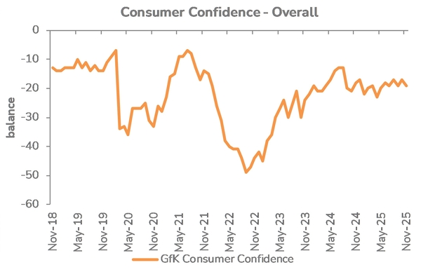 Falling CPI inflation to xx% improved real income sentiment marginally, but confidence remained low ahead of the Autumn Budget.