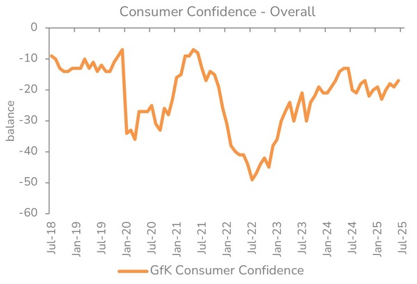 Retail sales stayed ahead of retail inflation in July (+xx% retail sales deflator exc. fuel). Sunny weather and summer events helped to boost the mood and encourage spend. The underlying caution that has characterised 2025 so far remains, however.