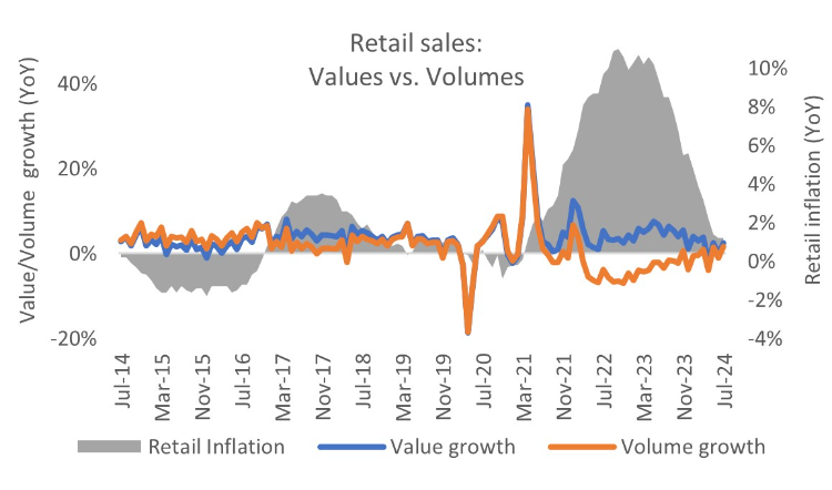 Inflation rose slightly to xx% in July. Importantly, grocery prices have normalised, with promotional spending up by 15% YoY (Kantar). Non-food has been in deflation for three months, driven by home-related categories. Earnings growth continued to outpace inflation, with regular earnings rising by xx% in the quarter to May and by xx% in June. However, households remain cautious to spend on non-essential retail and continue to prioritise savings over spending on big-ticket items.