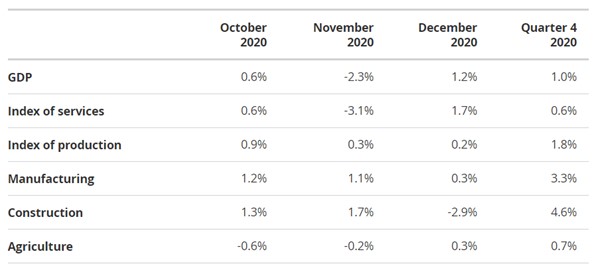 • On a monthly basis, GDP increased by 1.2% in December, above market expectations of 1.0%. This follows a revised 2.3% decline in November, as a second national lockdown weighed on economic activity.