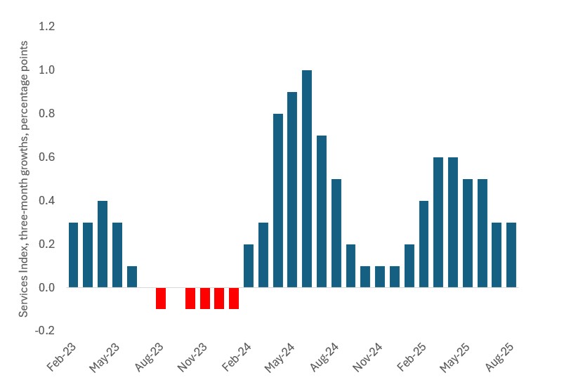 Services grew by 0.4% in the three months to August 2025