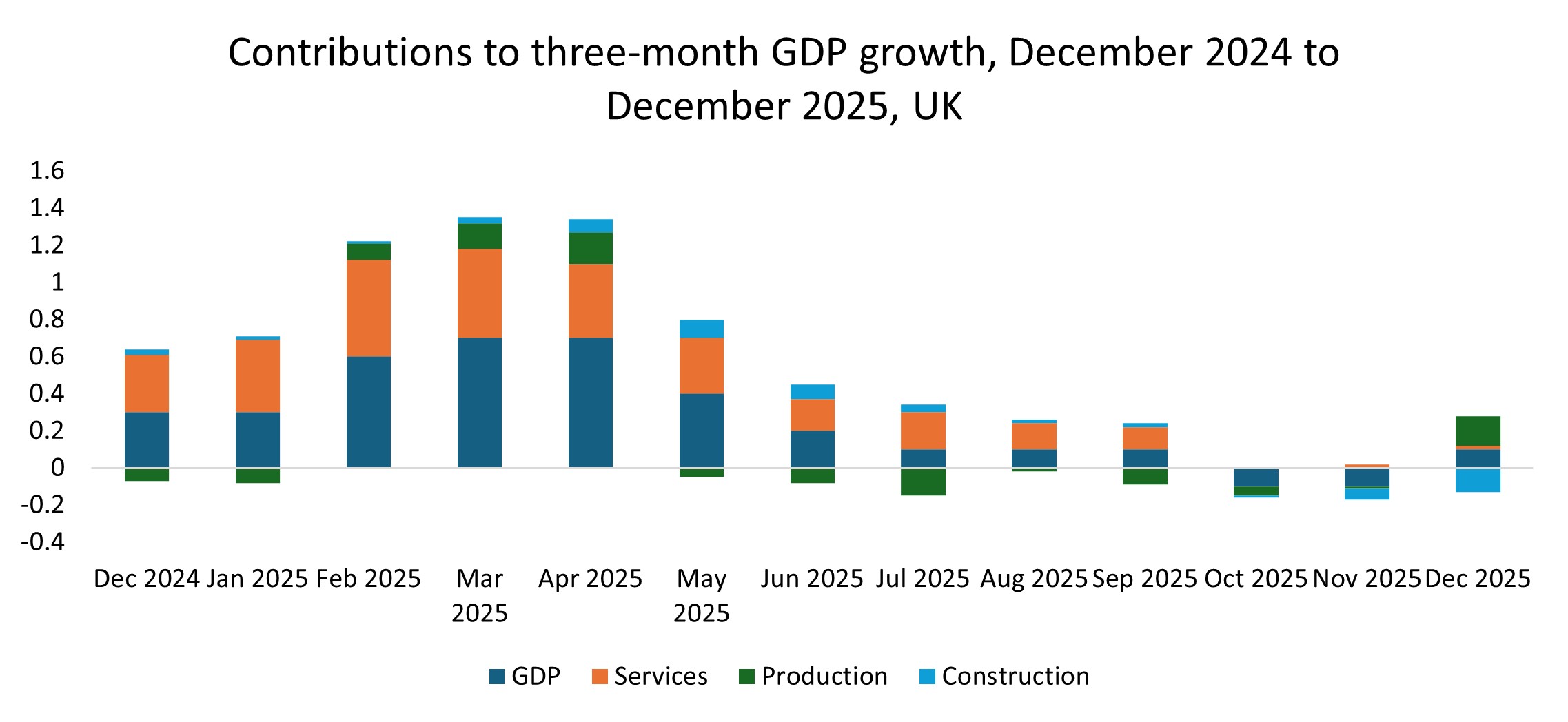 • Real gross domestic product (GDP) is estimated to have grown by 0.1% in the three months to December 2025, compared with the three months to September 2025. This follows falls of 0.1% in the three months to November and October 2025.