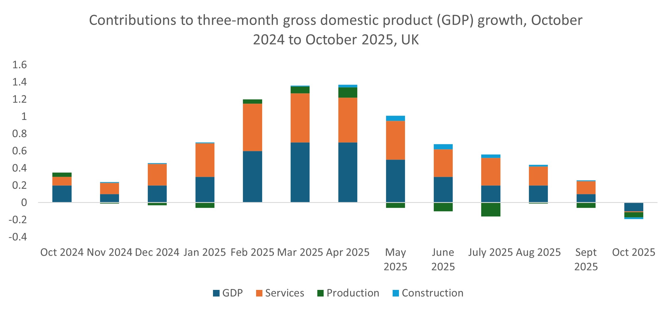 Real GDP fell by 0.1% in the three months to October 2025, following three-month on three-month growths of 0.1% in September 2025 and 0.2% in August 2025