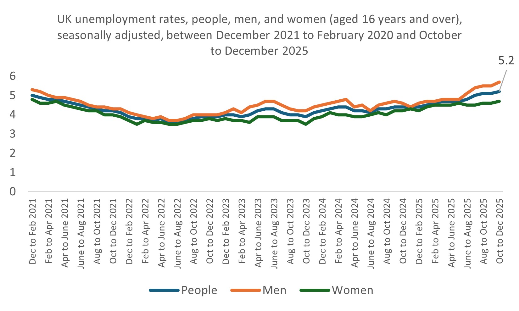 - The unemployment rate (aged 16+) rose to 5.2%, increasing on both the quarter and the year.