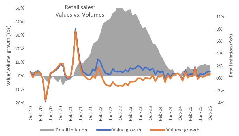 - In volume terms (non-seasonally adjusted, exc. fuel), retail sales increased by 1.4% YoY in October. It compares to a weak 0.4% rise a year ago.