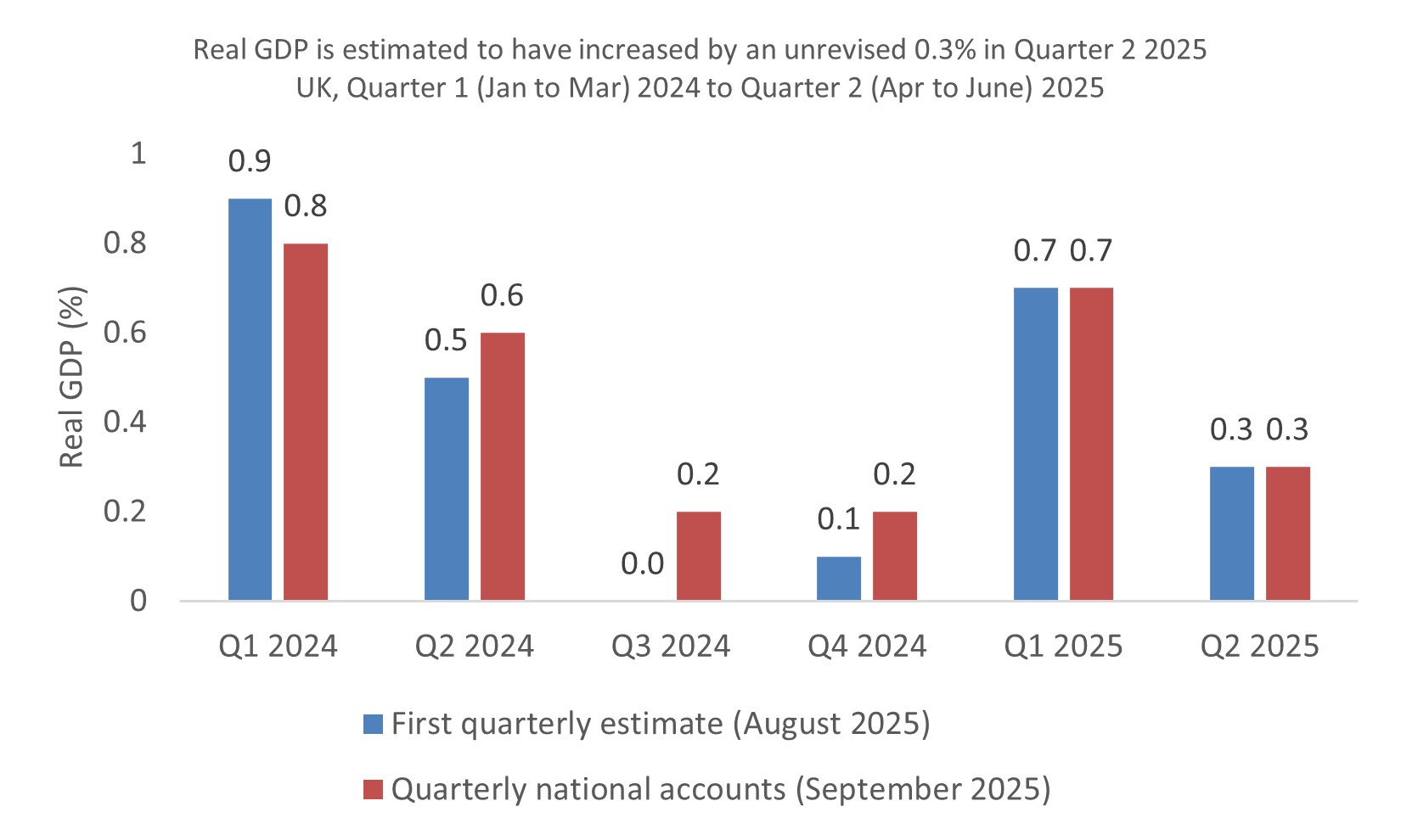 - UK GDP grew by 0.3% in Q2 2025, following growth of 0.7% in Q1 2025 (January to March). Compared with the same quarter a year ago, GDP is estimated to have grown by 1.2%.