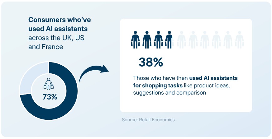 • 73% of consumers across the US, UK and France have already used AI assistants, signalling that AI-mediated discovery is now mainstream behaviour rather than a future trend.