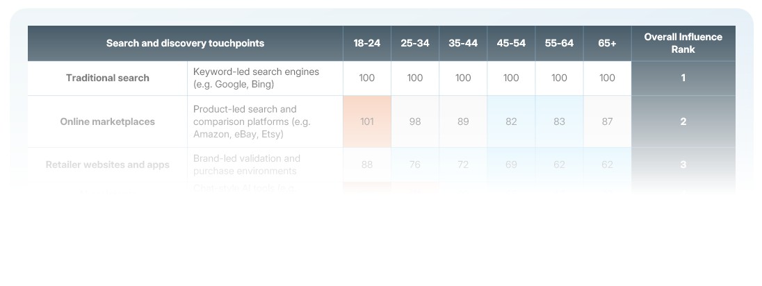 Traditional search engines remain the anchor across all age groups, but their relative importance weakens at younger ages as AI assistants and content-led platforms play a more influential role during discovery and research.