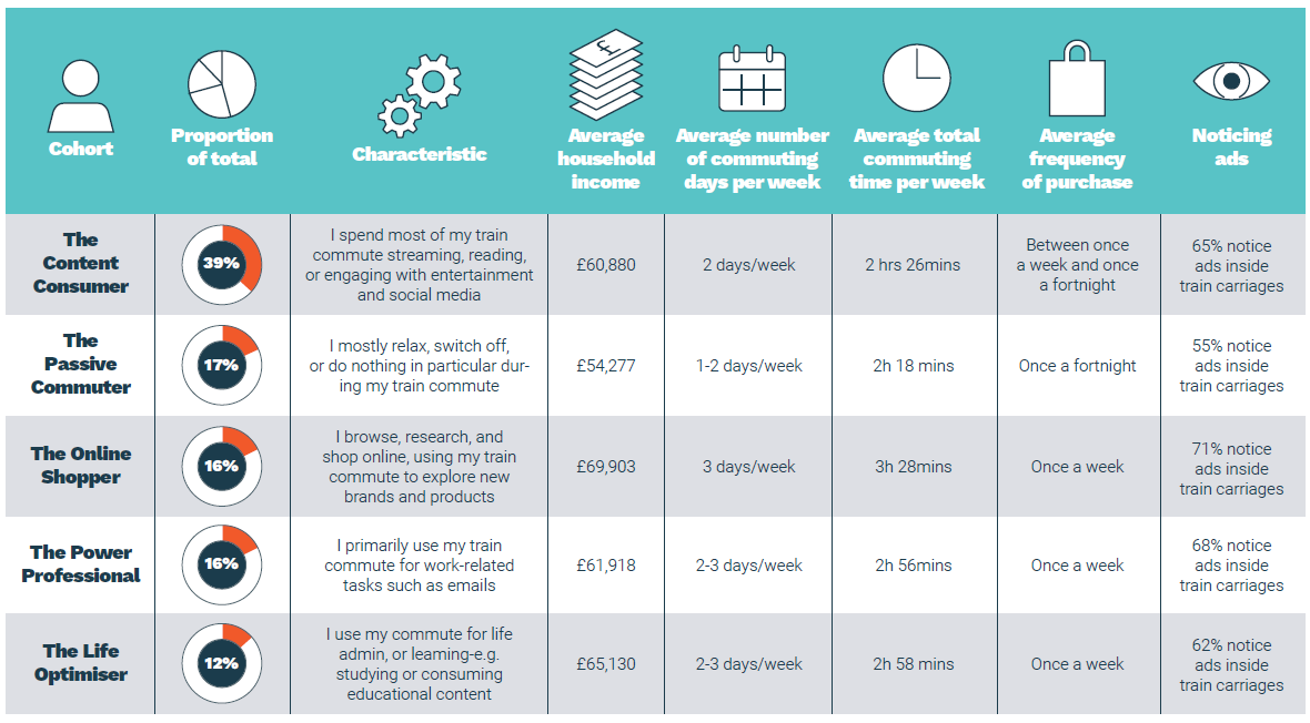 This figure breaks the commuter audience into distinct cohorts based on age, income, commuting frequency and digital behaviour. It highlights, for example, a sizable group of younger, affluent ‘online shopper’ commuters who are heavy users of ecommerce and streaming services. For brands, these cohorts illustrate where the highest-value opportunities sit and how different groups respond to the rail environment in different ways.