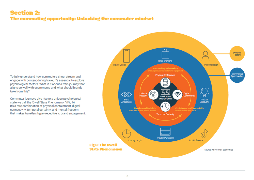 Our framework visualises the psychological conditions that make the train journey so commercially powerful. At its core are four drivers – physical containment, digital connectivity, temporal certainty and mental freedom – which together create an environment where commuters are primed to browse, discover and transact. Around this sits a ring of commercial implications, showing how brands can tap into the dwell state with relevant offers, content and services at precisely the right moment.