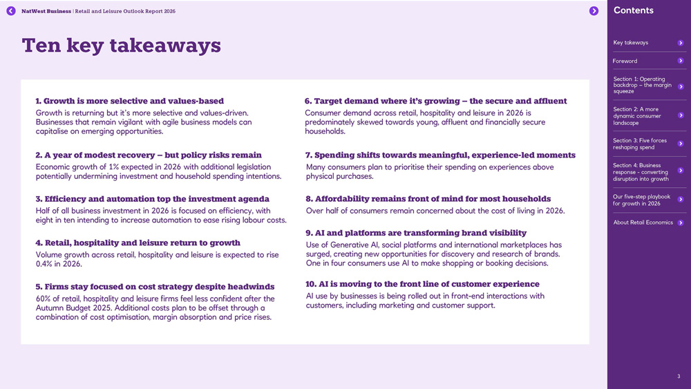 • Success in 2026 will favour businesses that defend margins without eroding experience, embrace AI while elevating human touchpoints, and invest with clarity in a structurally changed market.
