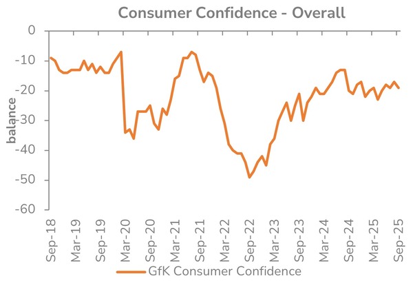 The macroeconomic setting remained challenging but stable. Consumer confidence fell to -19, with the cost of essentials and concerns over future tax increases in next month’s Autumn Budget continuing to dampen household sentiment.
